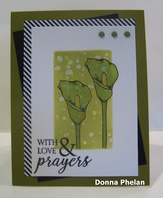 Using the Gina K Designs stamp sets, Elegant Florals and Sending Love I created this Sympathy card. I stamped the leafy vine stamp in Versa Mark and then Heat Embossed in Gold Embossing Powder. This became my 'hidden' panel.
