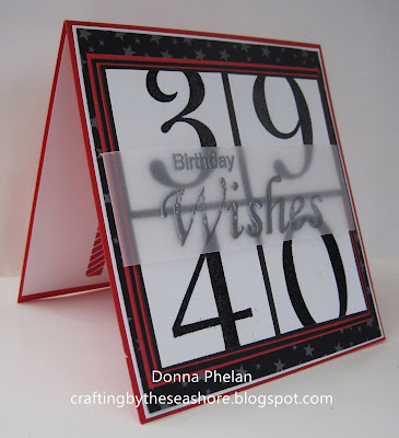 I used a set by Recollections for the numbers which were stamped in Amalgam Black ink and heat embossed in Black Powder. Each number was stamped on to a smaller square of card stock. Then I trimmed the tops and bottoms to show movement, going from 39 to 40....in the blink of an eye lol